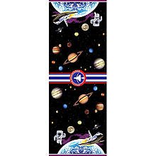 This is a plastic table cover featuring all over printing of a space scene.